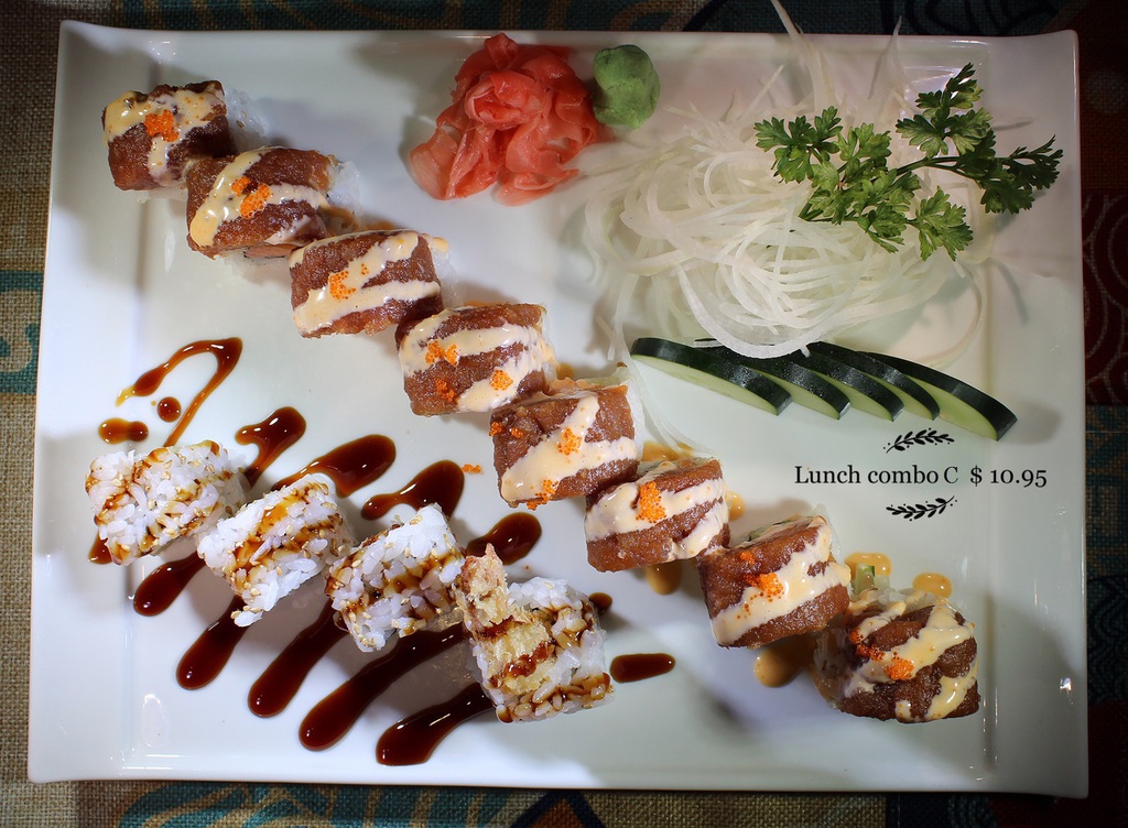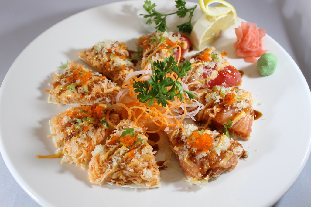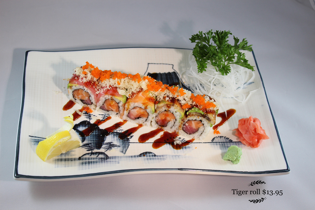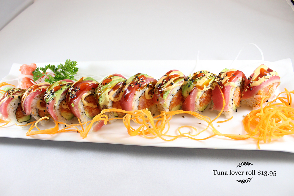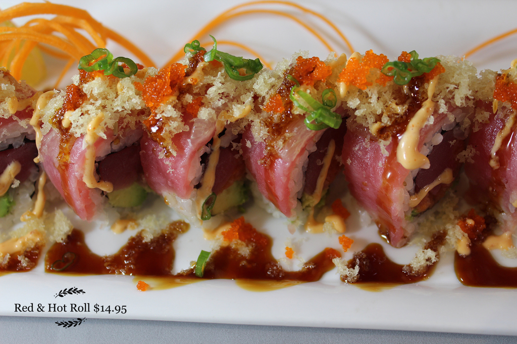 Jumbo lump crab meat, spicy tuna, jalapeño, cucumber, and tempura crunch on the inside; topped with fresh yellowtail and tuna, avocado, tobiko, and an original hometown sauce.