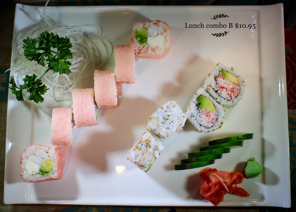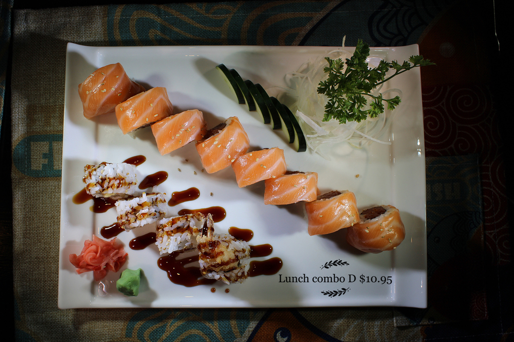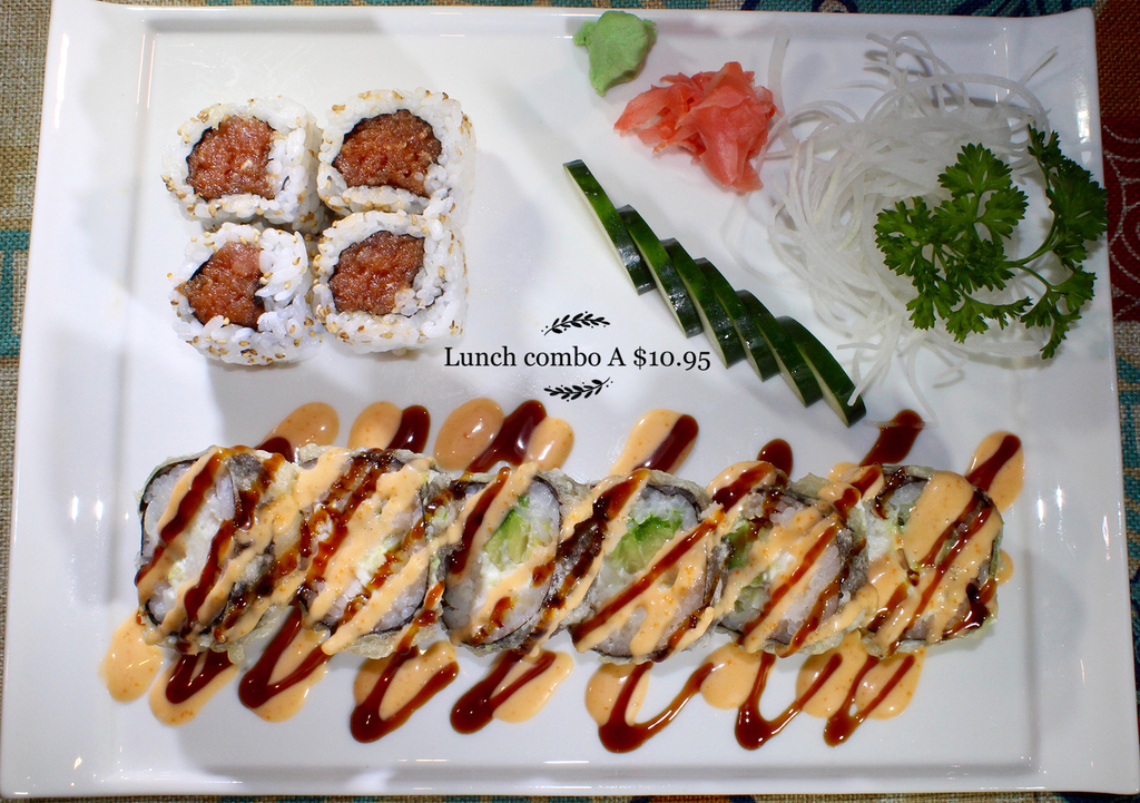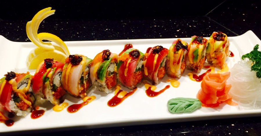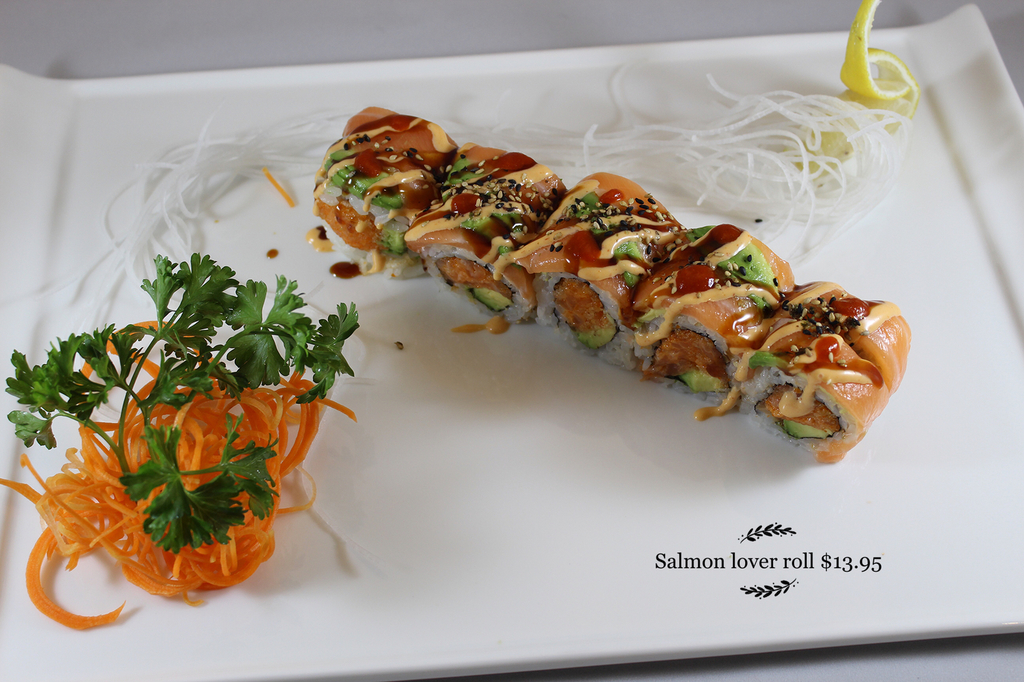 Jumbo lump crab meat, spicy tuna, jalapeño, cucumber, and tempura crunch on the inside; topped with fresh yellowtail and tuna, avocado, tobiko, and an original hometown sauce.